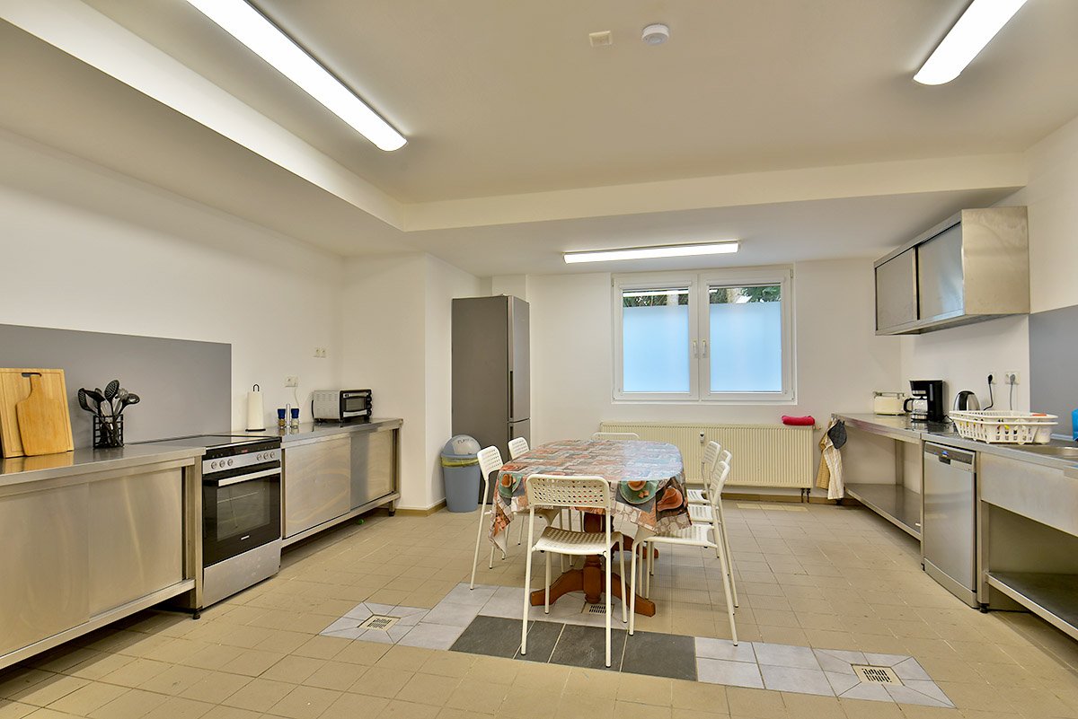 ✓ Gemeinschaftsküche: Herd, Pfannen, Töpfe, Geschirr, Esstische usw.